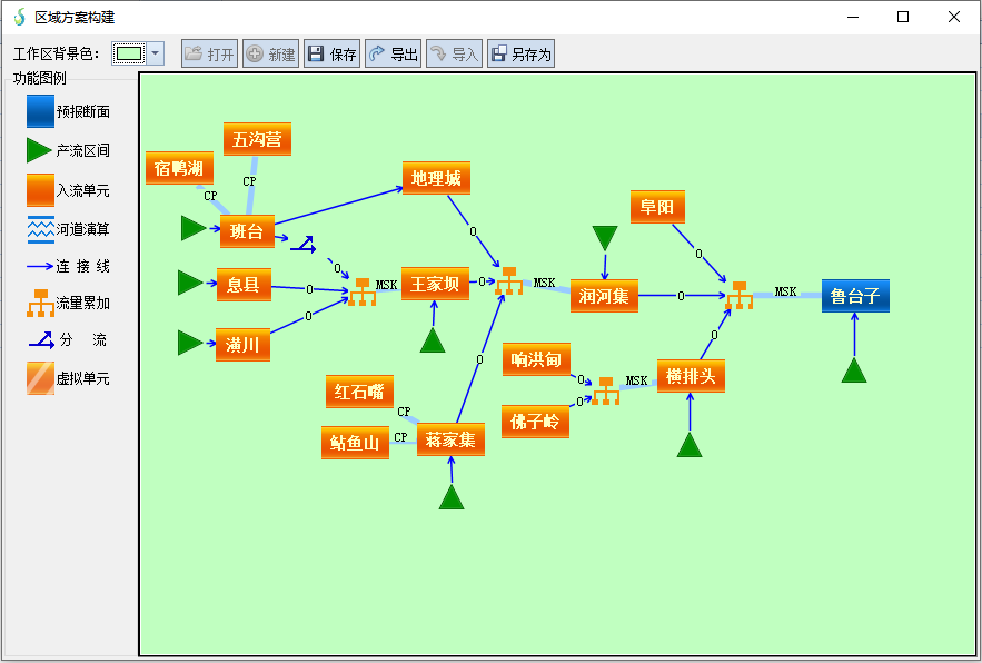 系統(tǒng)將集水區(qū)間、入流單元、預(yù)報(bào)斷面、虛擬斷面、河道等節(jié)點(diǎn)以不同的圖形概化成相應(yīng)的節(jié)點(diǎn)控件,通過拖拽各個(gè)節(jié)點(diǎn)控件,使用連接線可以構(gòu)造出流域中各節(jié)點(diǎn)間的關(guān)系,自動(dòng)設(shè)置各節(jié)點(diǎn)的屬性選擇預(yù)報(bào)模型和河道匯流方式。