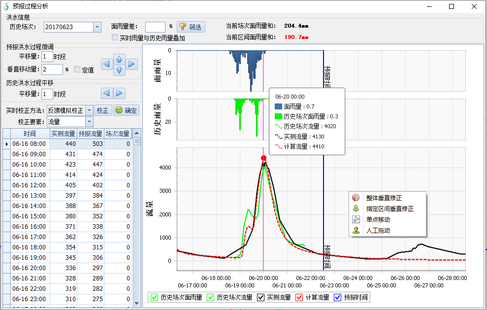 預(yù)報(bào)作業(yè)時(shí)系統(tǒng)能夠根據(jù)配置的預(yù)報(bào)方案快速計(jì)算出初步結(jié)果。同時(shí),預(yù)報(bào)人員可參照歷史洪水、實(shí)時(shí)水雨情信息等,結(jié)合自身預(yù)報(bào)經(jīng)驗(yàn),對(duì)預(yù)報(bào)成果進(jìn)行校正。
